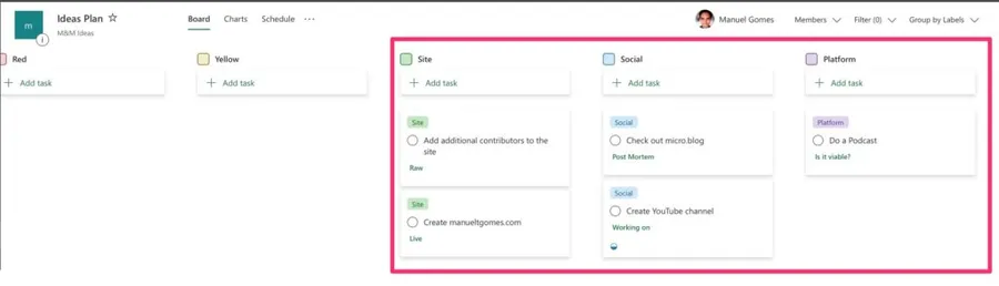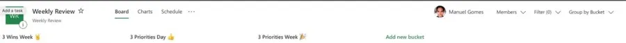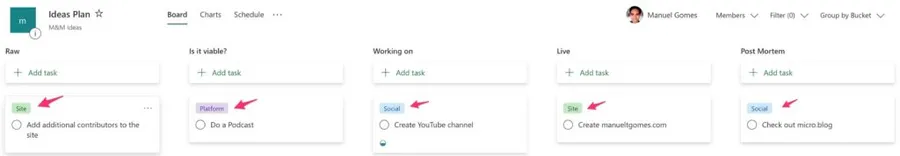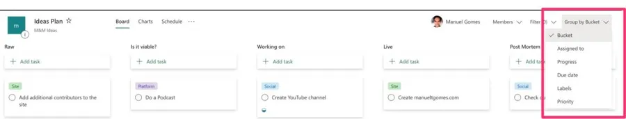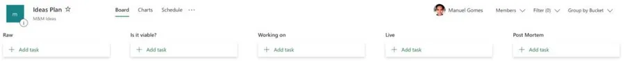 Microsoft Planner displays a bucket as a column in the UI, and it’s a way for you to segment information. It has a name, and its only job is to group vertically information that makes sense together or is in a particular state, for example. Each bucket will contain tasks, and you can move each task from one bucket to another. Here’s a typical example: