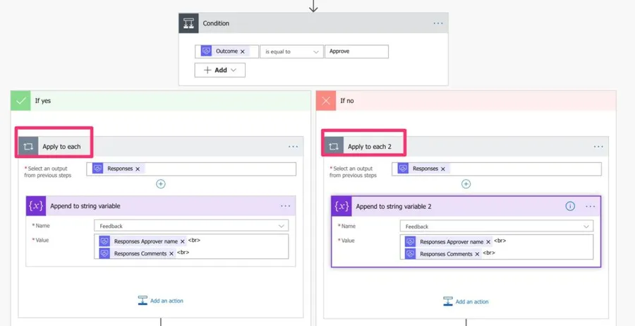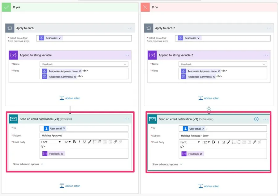 Both approval and rejection, in our case, have the same result. Sending an email back to the requester with the comments of each person, hence the variable that we defined before. It's also why we needed a “For Each“so that we could collect the feedback from each user. This is true even if we send it to just one person, so be aware of this.