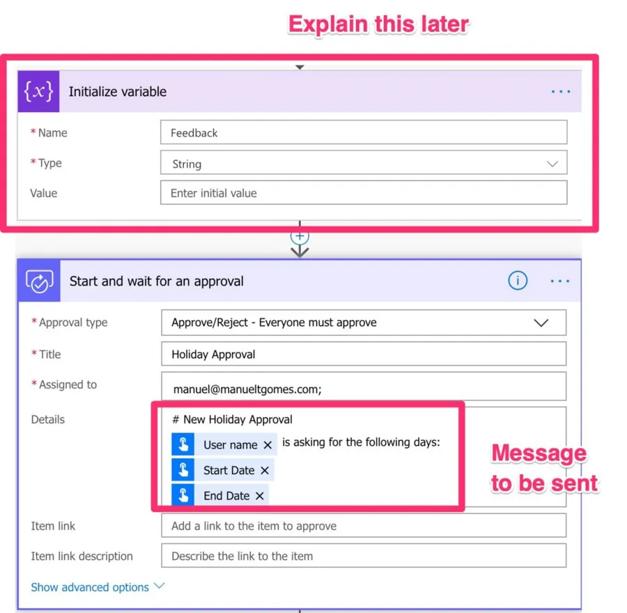 In the video, I’m creating an “Instant” event that allows for a simple holiday approval. The user that wants the holidays triggers the Flow with the desired days, and the manager receives an approval notification.