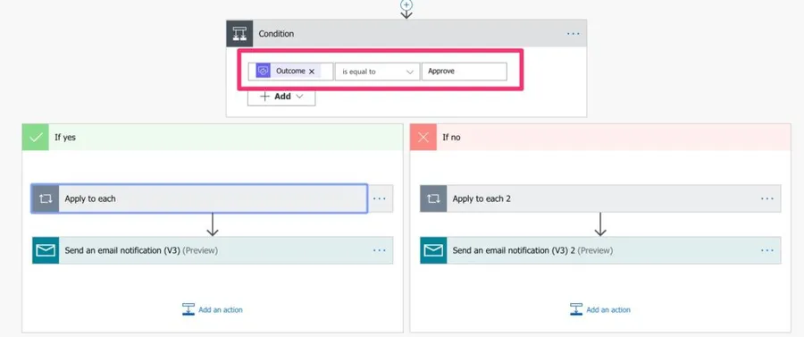 As you can see, there’s no step between setting up the approval and telling flow to wait. All is automatic. We need to figure out what were the replies after. To do this look at the “Outcome” and see if it’s approved or not. Again, this approval is the result of all replies from the users.