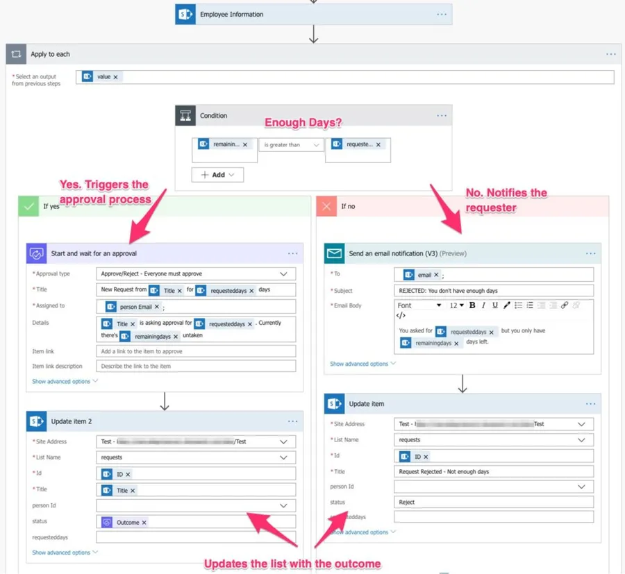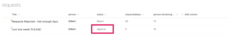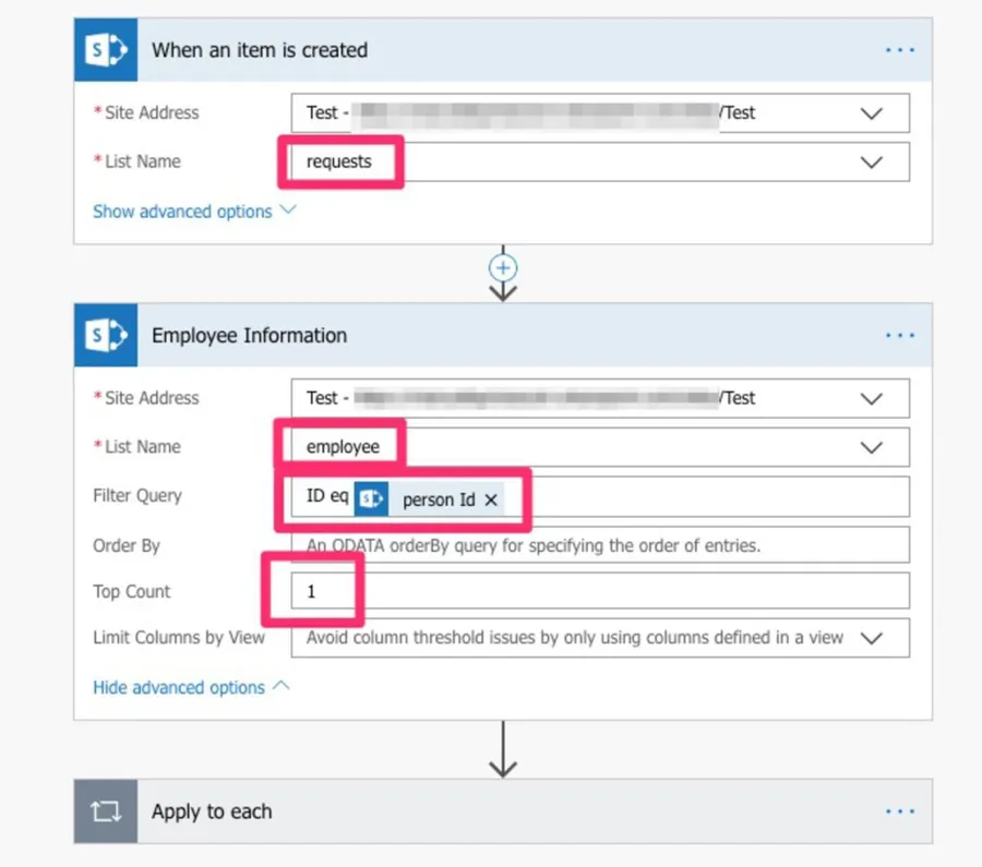 First, the trigger monitors if there’s any new item in the “requests” list. If there is we find the employee in the employee table by searching by ID and limiting the return to 1 since we’ll always have only one person with the same ID.
