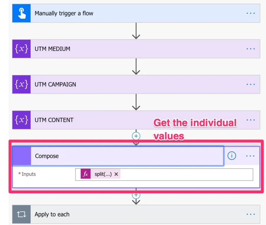 Sometimes it’s handy to have that information elsewhere so, given a specific URL, we can quickly parse these values and get them individually and store them. For example, if you want to keep a list of all parameters used in campaigns and provide that list to the marketeers, then you need to get them individually. You can give them a Flow that they can feed a URL, and that information is automatically stored for them to reference in the future.