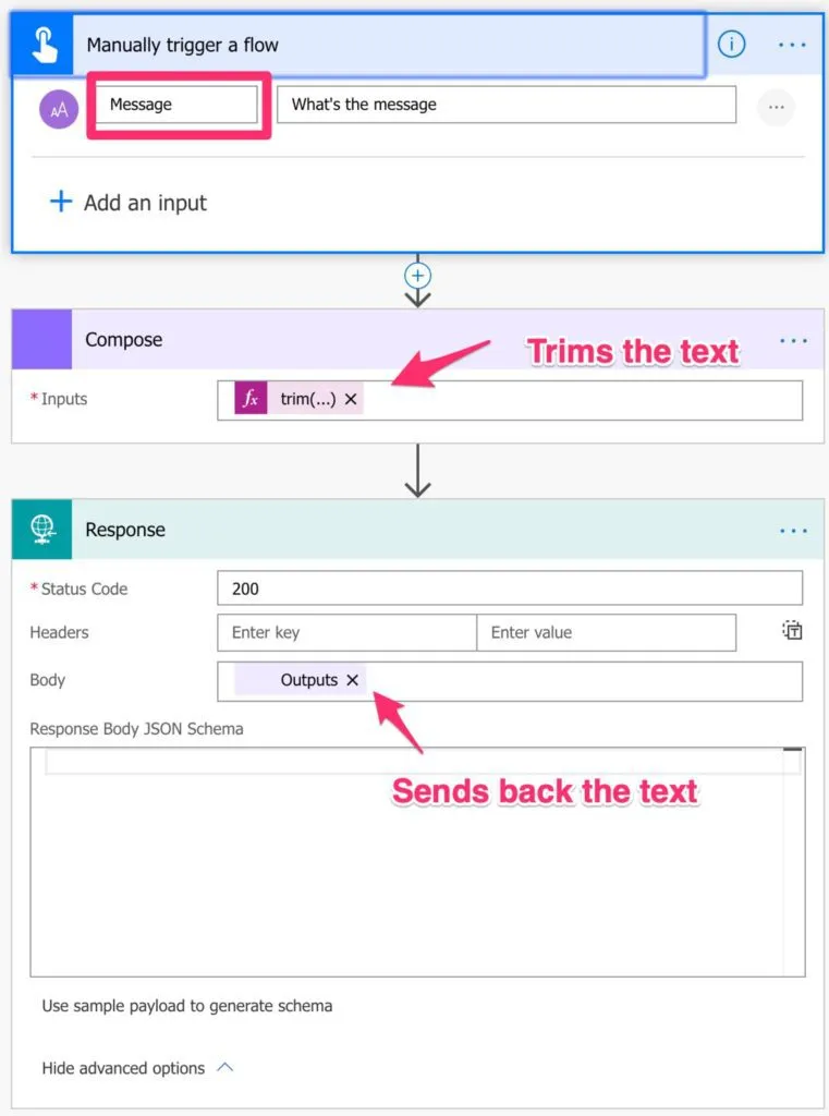 To demonstrate, we’ll create a Flow that receives an input, trims it, and returns it back. I know it’s simple and it's just for demonstration purposes but you could think of a Flow that parses texts based on your company’s naming conventions, for example. This would keep consistency and would be useful in many instances.