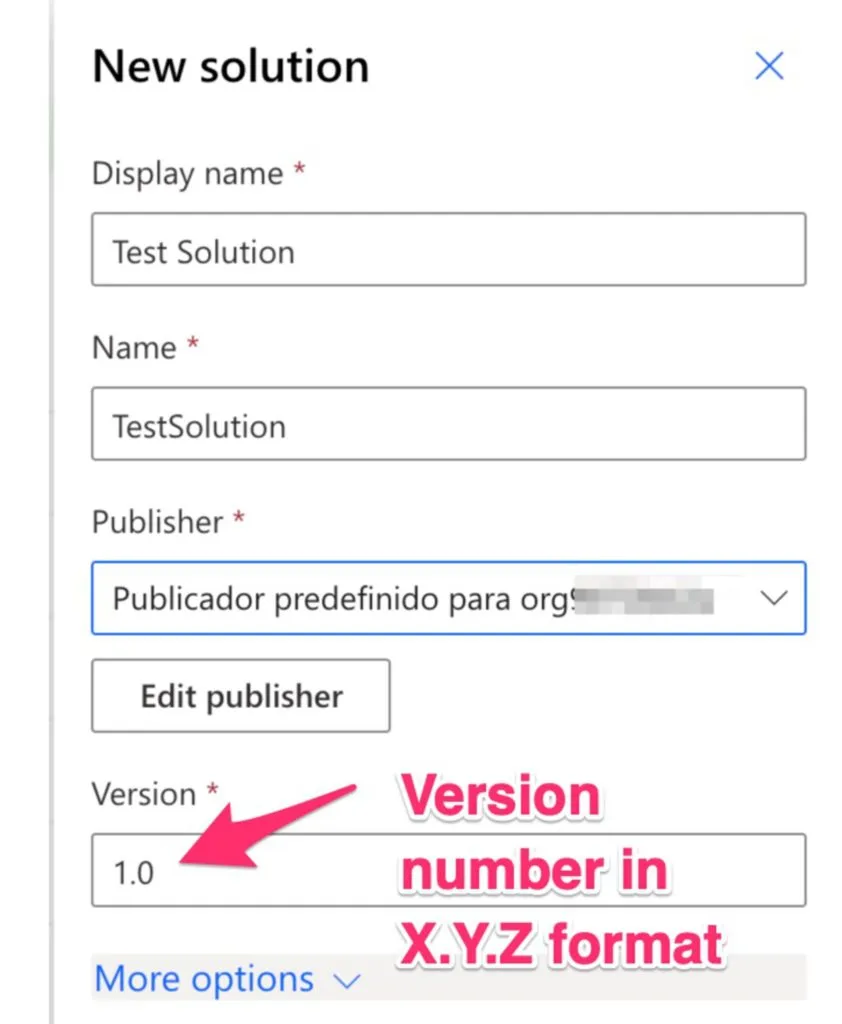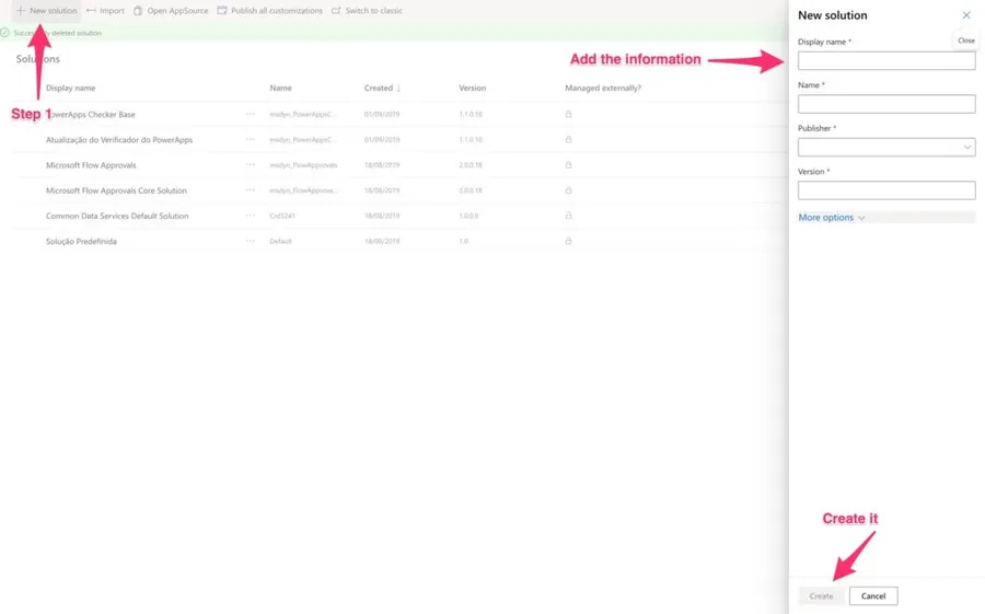 In this case, I prefer to use the predefined publisher (text is in Portuguese but you should see it as "Predefined Publisher for orgXXXXX"), but you can create a new one. Again, I'll go into much more detail regarding "Solutions" soon in another post.