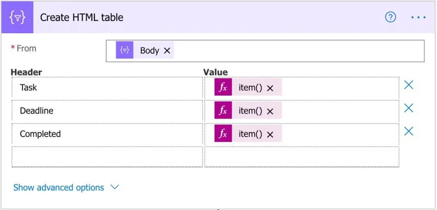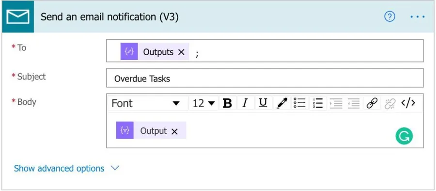 OK, welcome to the last step, and it’s an easy one. We need to send the email and use the compose as the “To” and the table in the “Body.”