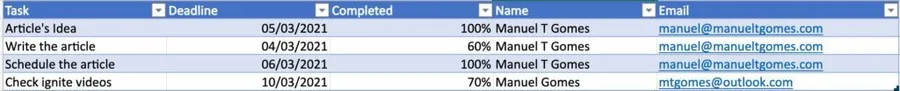 So let’s set up an Excel with that. A task name, a due date, a person’s name, and an email address.