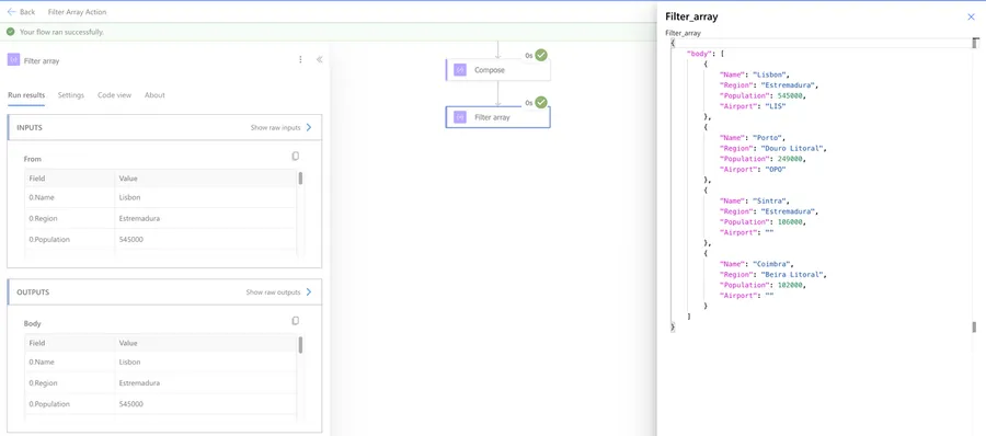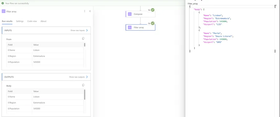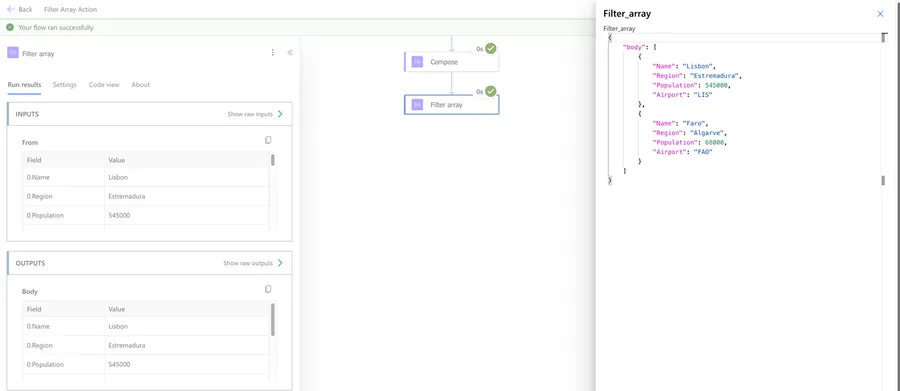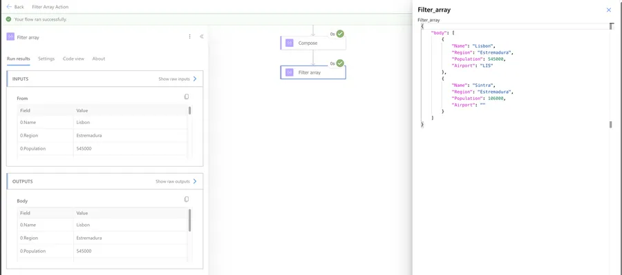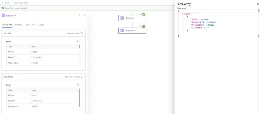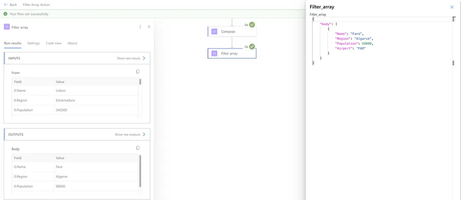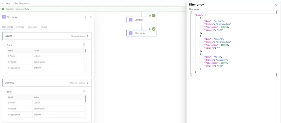 The "Filter Array" action returns a new array containing only the items that matched our condition. The items keep their original structure - the action doesn't change the shape of the objects, just removes the ones that don't match.