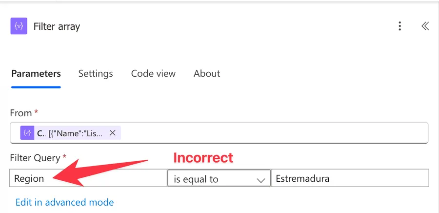 If we run this, it will run but won't return anything. This is because we can't include the value that we want to search and need to use the "item" function that references the item that we want to filter. This is important because we have multiple items and the filter array action needs a way to know what element in the array we want to filter. So the correct way to filter would be: