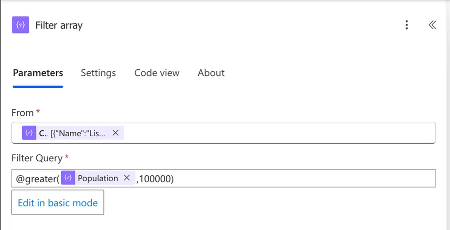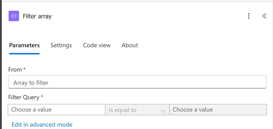 By default, the "Filter Array" action opens in basic mode. This gives us a visual condition builder with three parts: