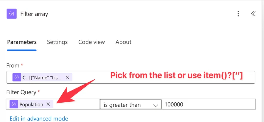 In advanced mode, we write the filter condition as an expression. The key thing to know is that we use item() to reference the current array item being evaluated. To access a property on that item, we use bracket notation: item()?['PropertyName'], like we did before.