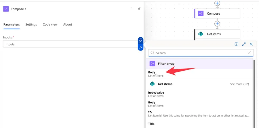 This one catches a lot of people. After the "Filter Array" action, when we try to use its output in subsequent actions, the dynamic content panel only shows "Body" and "Item."