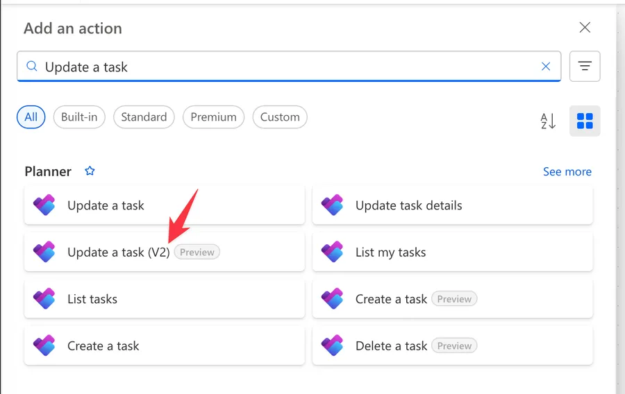 To find it, you can search for the "Update a task" action. You'll notice there are two versions available. The one we want is labeled "Update a task (V2)" with a "(Preview)" tag.