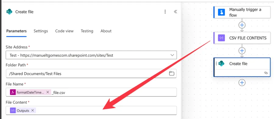 You can provide the contents of a text file directly in the file contents and the file will be created with that. For example, let’s say that you’re creating a CSV file and want to save it somewhere.