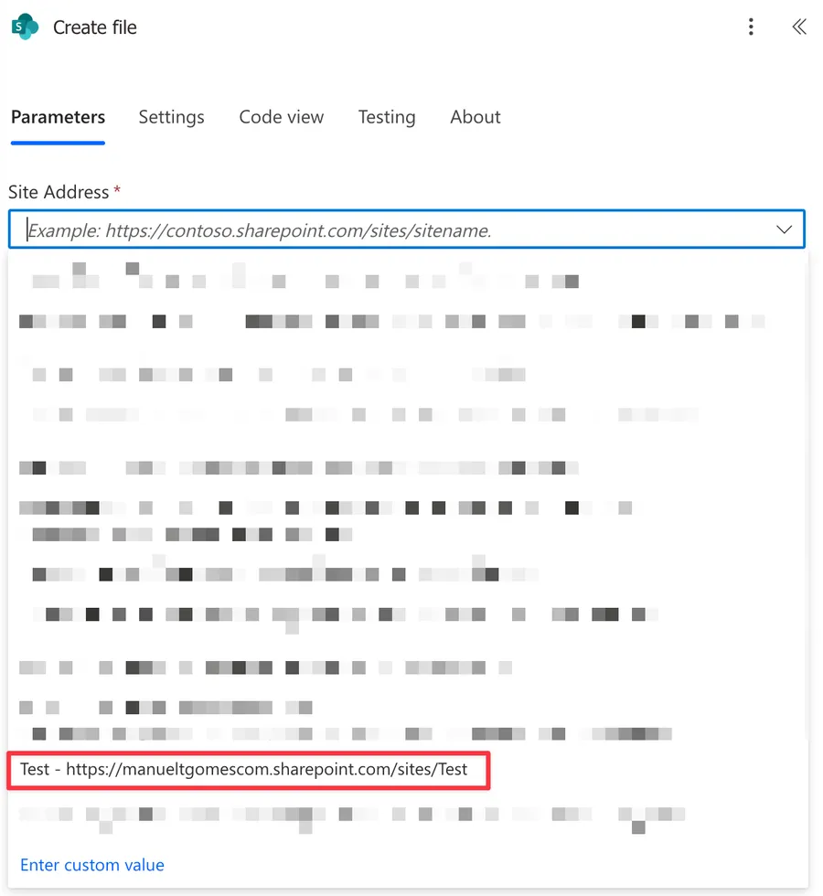 For example, https://manueltgomescom.sharepoint.com/sites/Test is correct but https://manueltgomescom.sharepoint.com/sites/Test/Shared%20Documents/Forms/AllItems.aspx is not. Like I mentioned, ideally always pick from the dropdown.