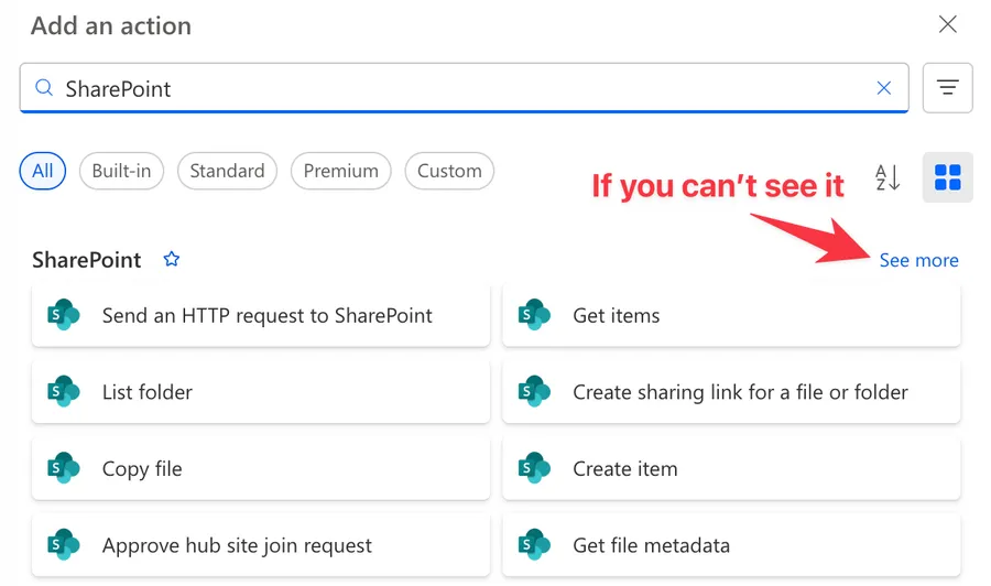 If it doesn’t show up, you can provide the link yourself. Notice that Power Automate asks you for the "Site Address"
