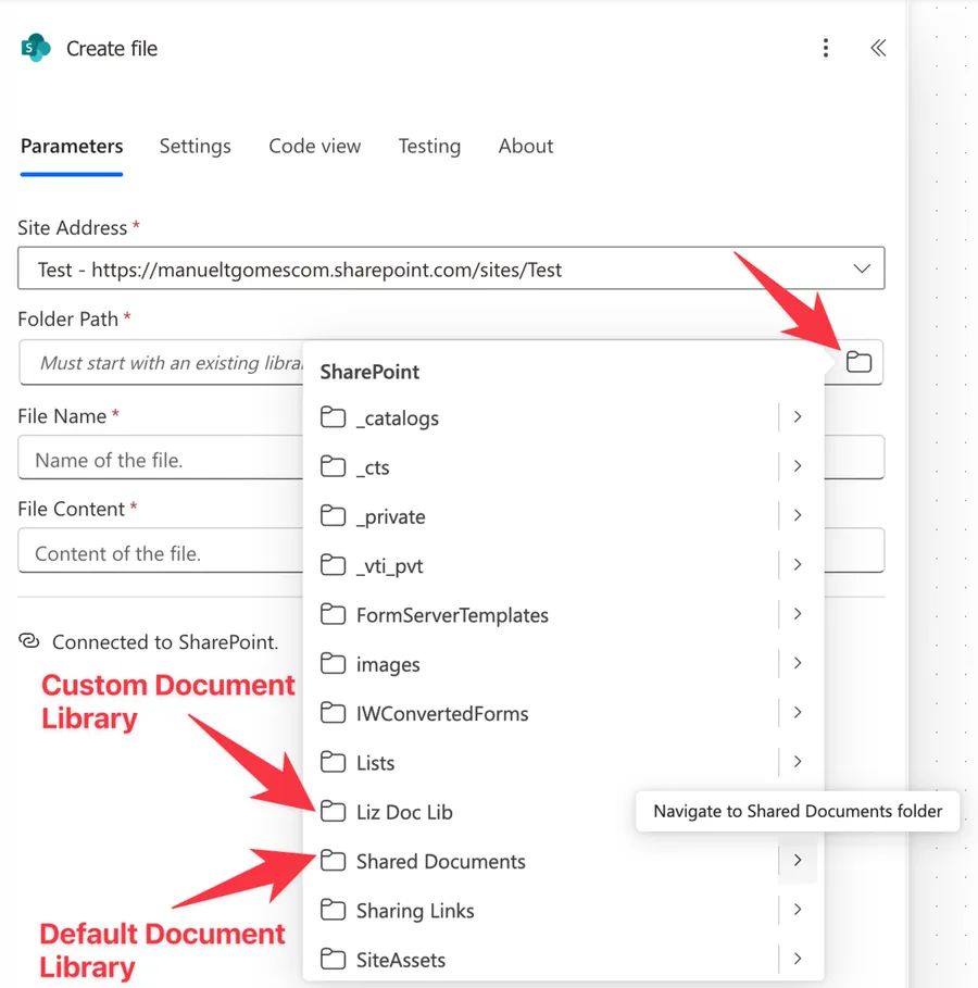 Now that we know the site where to find it, let’s take a look at the folder. We need a place to save the file, so we can pick from the document libraries that exist in the site.