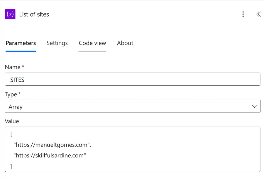 Create a simple array variable (in my case called "List of sites") using an Initialize variable Action. This way you can have a central list of sites that you can change over time. Be careful to define it as an array and define the value as an array as well, otherwise it won't work.