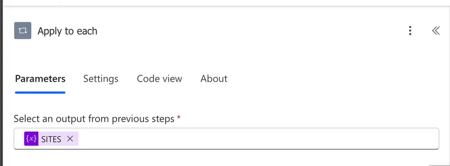 Now that we have the list of sites, let's use an Apply to Each to go over them. Nothing fancy here.