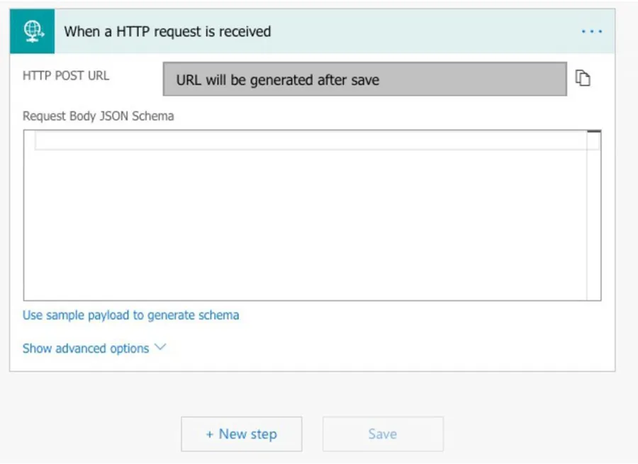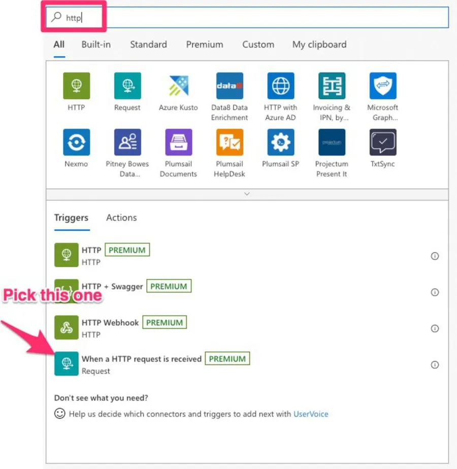 Once the flow is ready, let’s add the trigger to make it a web service. To do that, select “HTTP” and “When an HTTP request is received.”