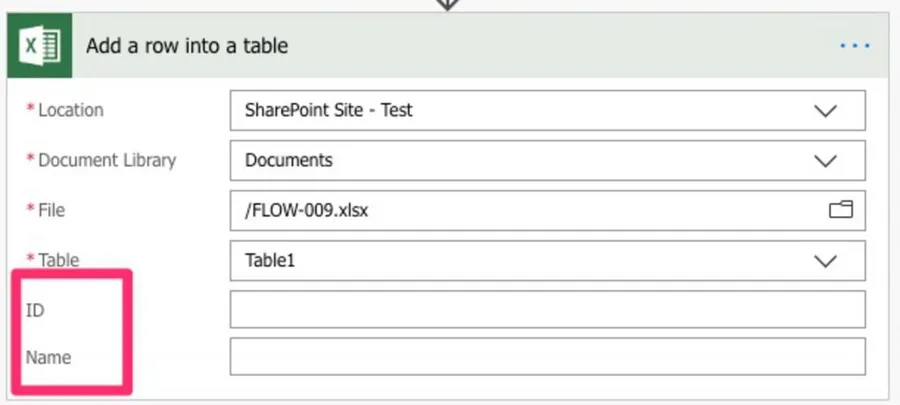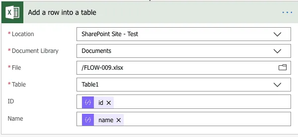 Notice that the two fields? Look familiar? Flow analyses the Excel and extracts the fields; in this case, the ones that we created before. Let's add the values from the “Parse JSON” step before: