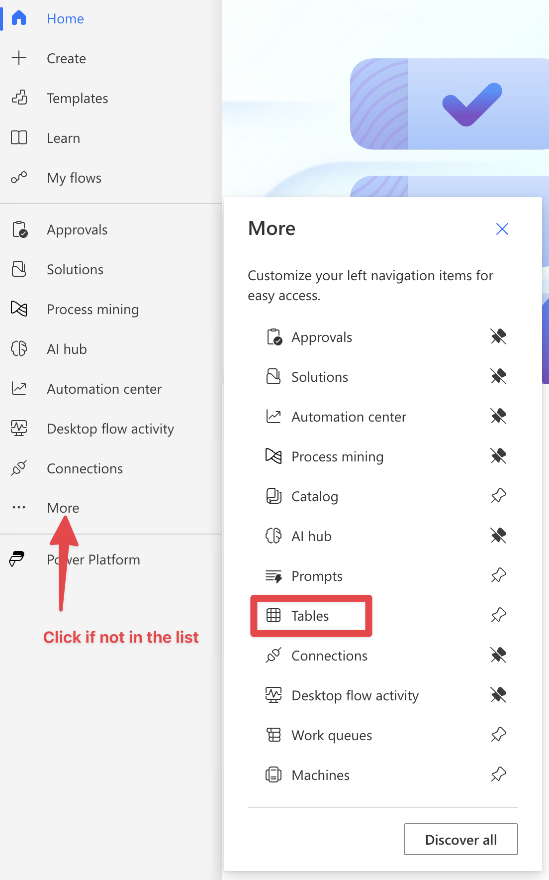 In Power Automate, you’ll see in the left menu an option called “Tables.” If you don’t, you can click “More,” and it will show in the list.