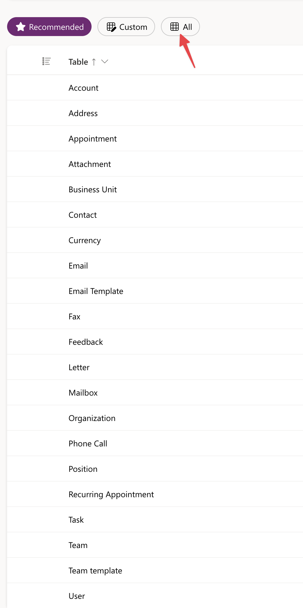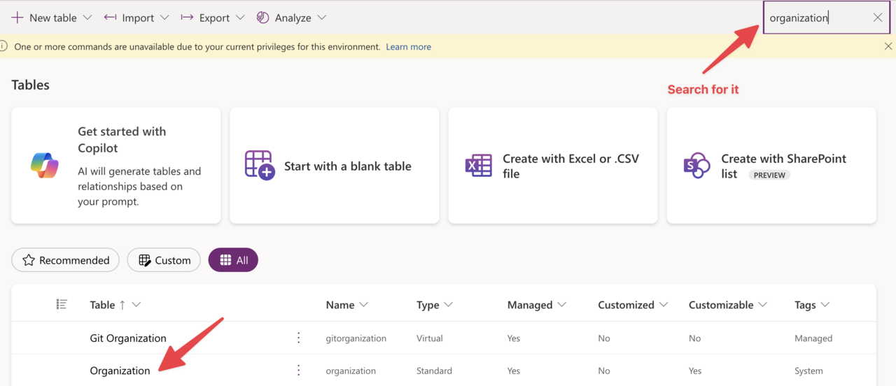 You’ll see a list of tables that manage a lot of the features that you use. The list of features are not exclusive to Power Automate, but also Power Apps and other tools. There are a lot of tables, but we need to search for one called “Organization.” To do that, expand by clicking “All” and search for it.